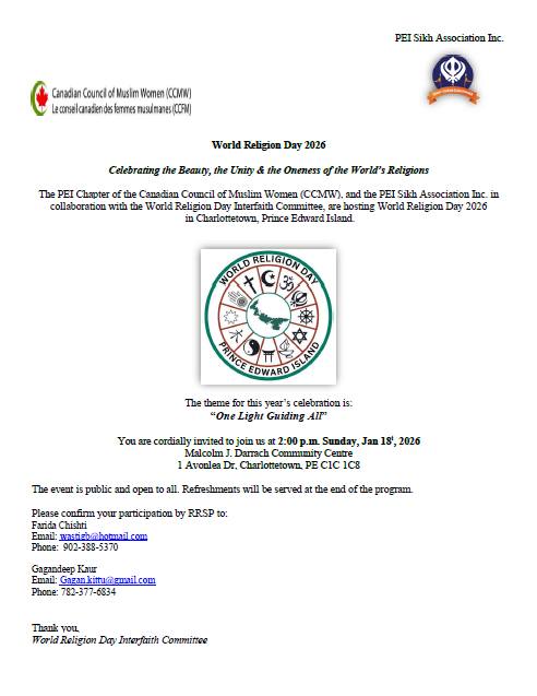 The PEI Chapter of the Canadian Council of Muslim Women (CCMW), and the PEI Sikh Association Inc. in collaboration with the World Religion Day Interfaith Committee, are hosting World Religion Day 2026 in Charlottetown, Prince Edward Island.