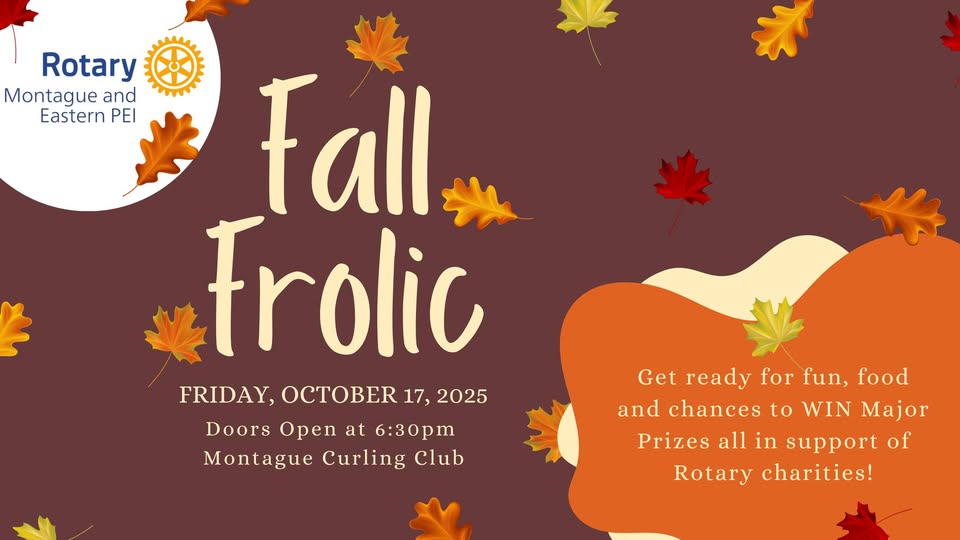 Rotary’s Fall Frolic will take place Friday, October 17th at the Montague Curling Club! This fun-filled event will feature an elimination draw for cash prizes, a delicious meal catered by The Sizzler and Live Music. All proceeds will support charitable organizations in Eastern PEI funded through the Rotary Club of Montague & Eastern PEI. 1st Prize - $5,000 2nd Prize - $2,500 3rd Prize - $1,500 4th Prize - $1,000 5th Prize - $500 PLUS bonus draws throughout the evening!…