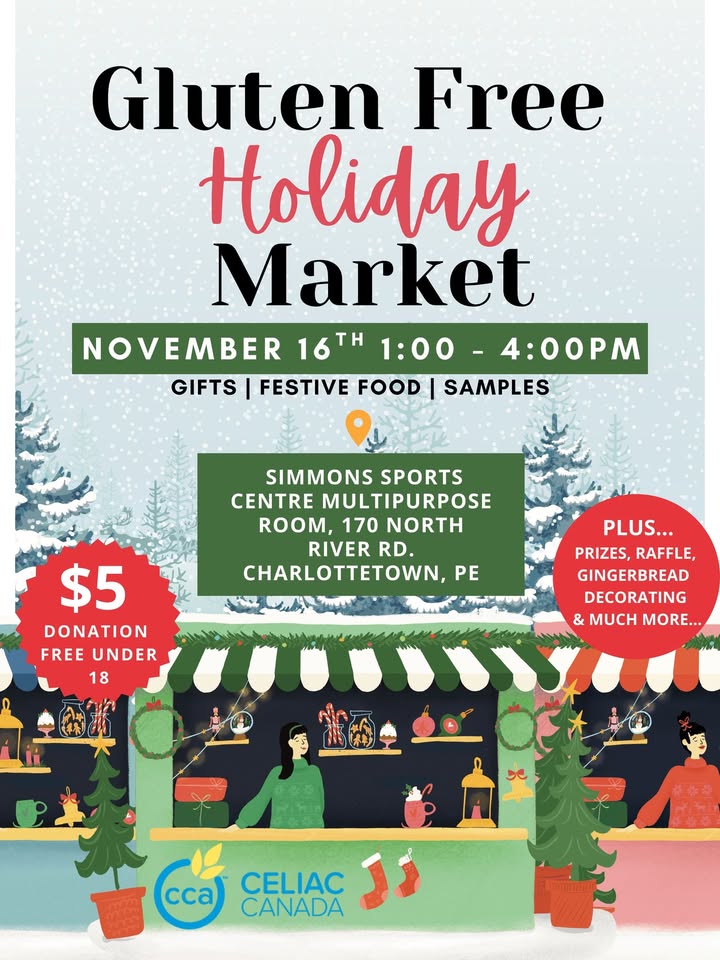 Get into the festive spirit at PEI’s Gluten Free Holiday Market on Sunday, November 16th from 1:00 – 4:00 PM at the Simmons Sports Centre Multipurpose Room (170 North River Rd, Charlottetown, PE). This special event will feature: Unique gifts & festive food Free samples A raffle, prizes & gingerbread decorating Fun for the whole family! Admission is just $5 donation (free for those under 18). Hosted by PEI Celiac Canada (CCA), this market is the perfect place to shop local, discover gluten-free treats,…