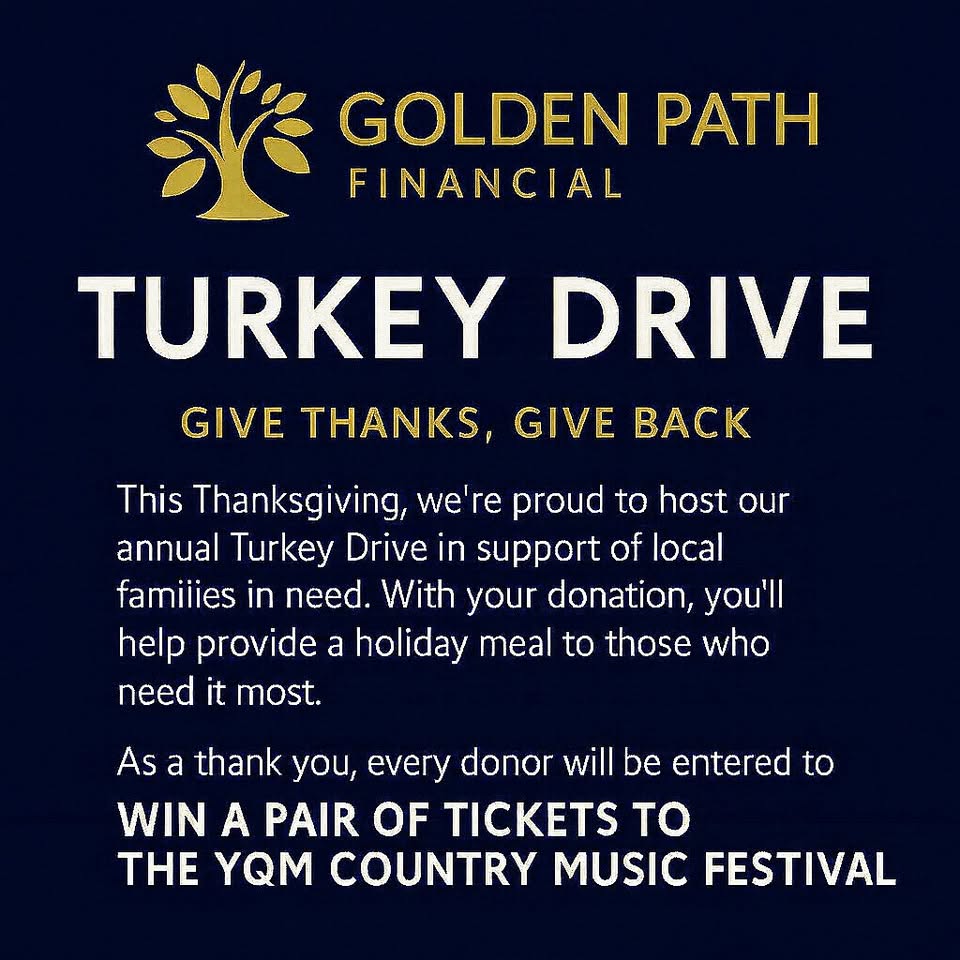 Golden Path Financial Turkey Drive – Give Thanks, Give Back This Thanksgiving, we’re proud to host our annual Turkey Drive in support of local families in need. With your donation, you’ll help provide a warm holiday meal to those who need it most. �On October 7th, 8th, and 9th please drop your turkeys off at one of our two locations between 8:30am-3pm: 1.) Salvation Army Charlottetown located at 158 Fitzroy St. Charlottetown PEI. (Ask for Ruthie Webster and she will…